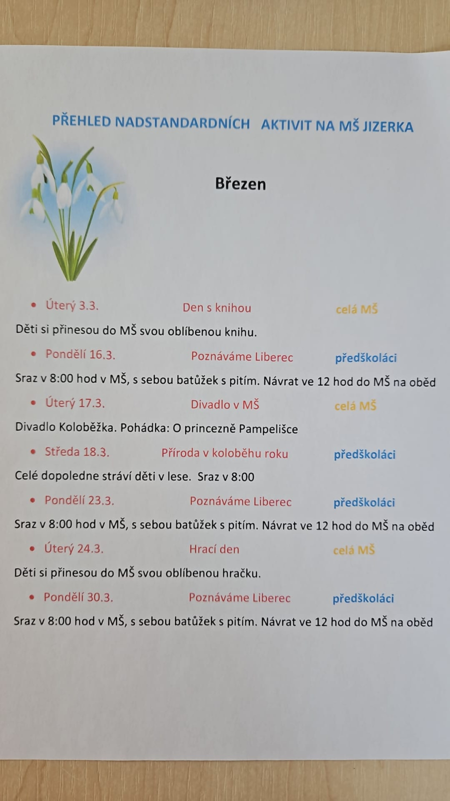 PŘEHLED NADSTANDARDNÍCH AKTIVIT NA MŠ JIZERKA Březen