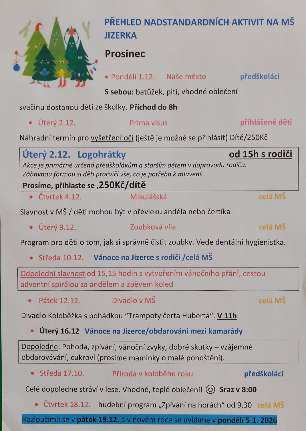 PŘEHLED NADSTANDARDNÍCH AKTIVIT NA MŠ JIZERKA Prosinec