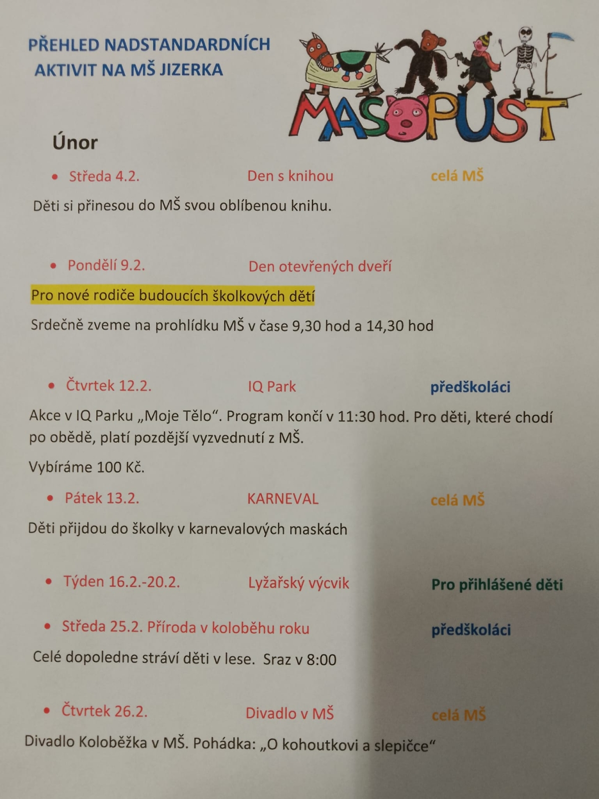 PŘEHLED NADSTANDARDNÍCH AKTIVIT NA MŠ JIZERKA Únor
